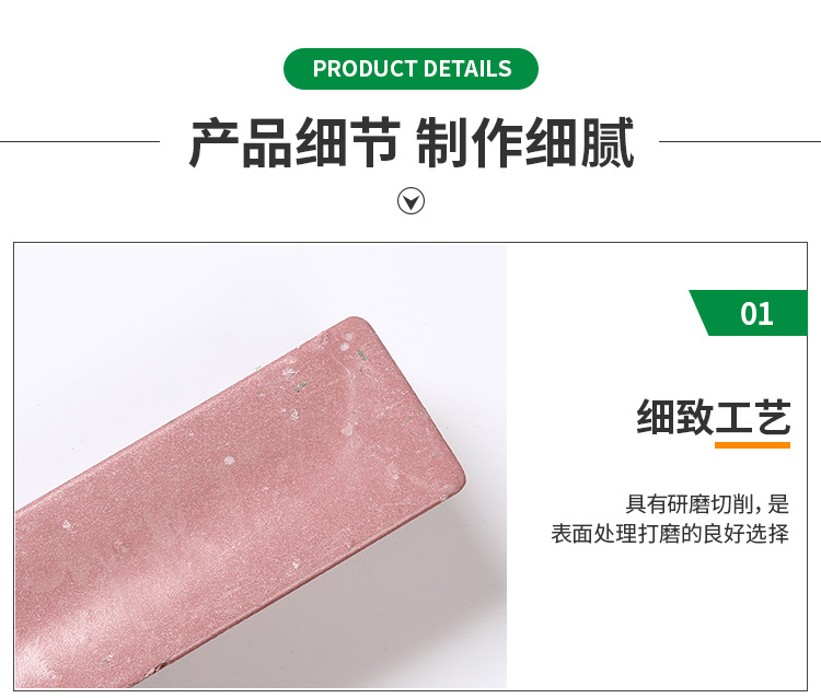 適用于一般鋼材,如不銹鋼、不銹鐵、鐵、銅、鋁等金屬進行中至精細(xì)研磨。此產(chǎn)品對工件的磨削力與打磨后工件的光亮度兼顧得比較好。能撤底去除工件表面上的砂眼、氧化皮等,使工件表面平滑如鏡,并產(chǎn)生優(yōu)良的光澤度。現(xiàn)時各廠家在不銹鋼餐具、廚具、刀具、管材、表帶等的中至精細(xì)研磨方面大量選用此產(chǎn)品。通常配合麻輪使用。