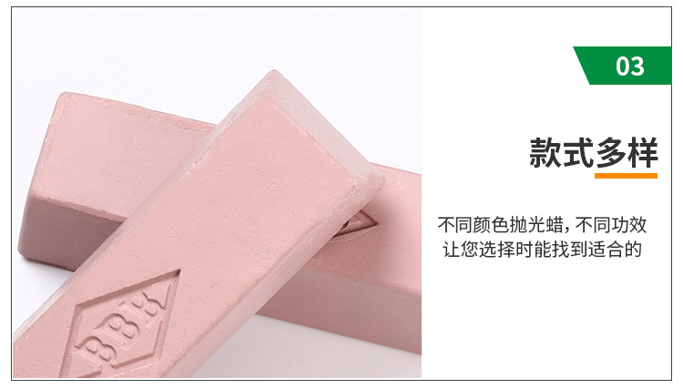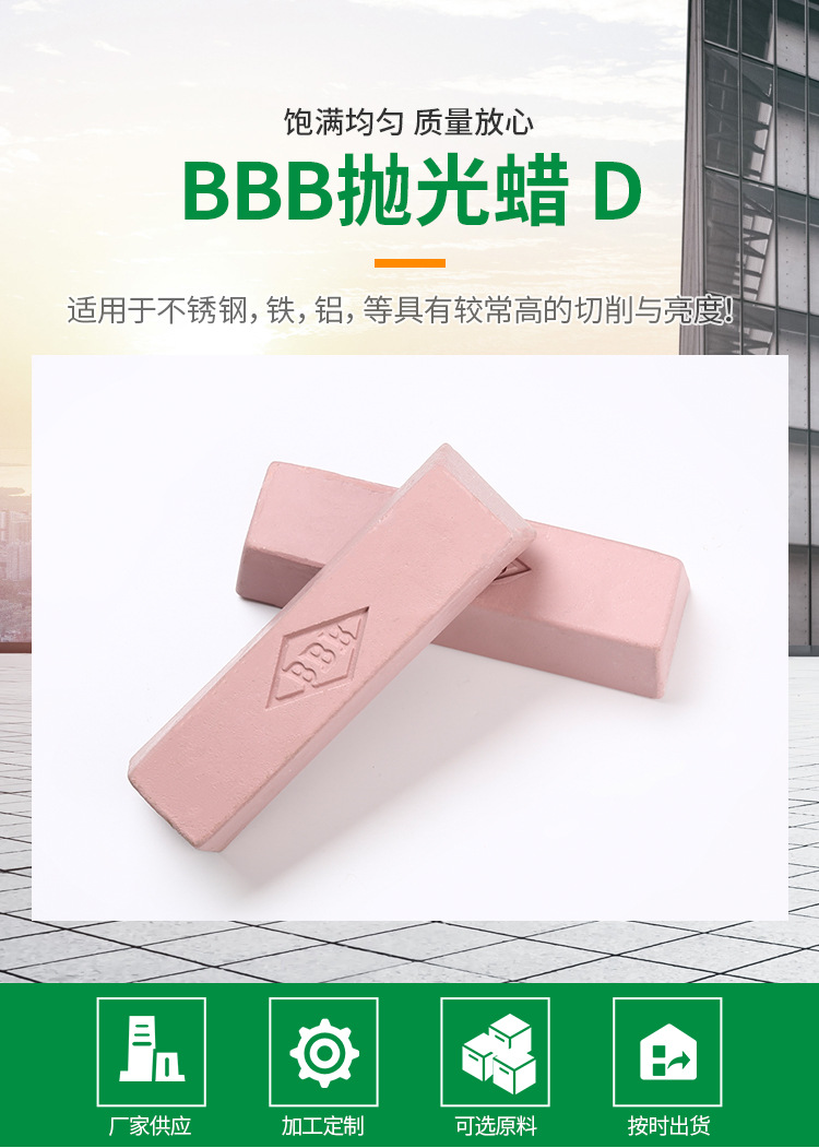 溫州華銘拋光研磨材料有限公司提供的bbb粉色拋光蠟(拋光臘)可用于金屬、不銹鋼、木雕玉石等固體打磨拋光用,可以增加金屬、不銹鋼、木雕玉石等固體光澤,保護產品漆膜免受潮濕、劃傷與灼傷的作用。正確地使用上拋光蠟可使產品更富于光澤。